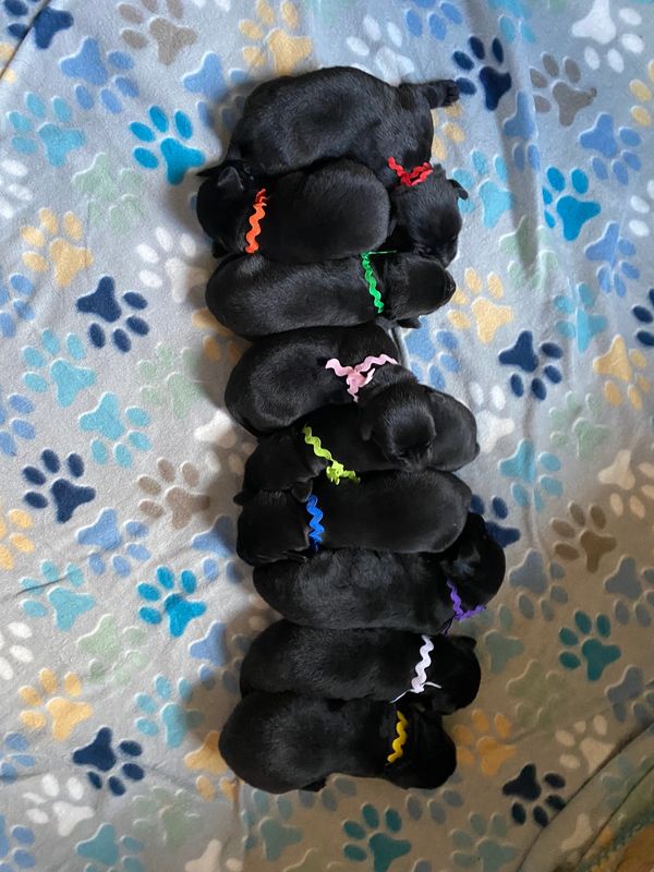 By time our puppies go home at 7 weeks old they are already introduced to birds/retrieving, they play in the water, they are very well socialized, and use to a variety of noises. They get their first (DHPPC) puppy shot at 6 weeks before they go home and are put on a deworming program. Our Labrador Retriever Pups are Guarantee on Eye, Hip & CNM & EIC Testing. All our Lab pups go home with a packet which includes; AKC papers, a food sample, health record, and puppy training tips.